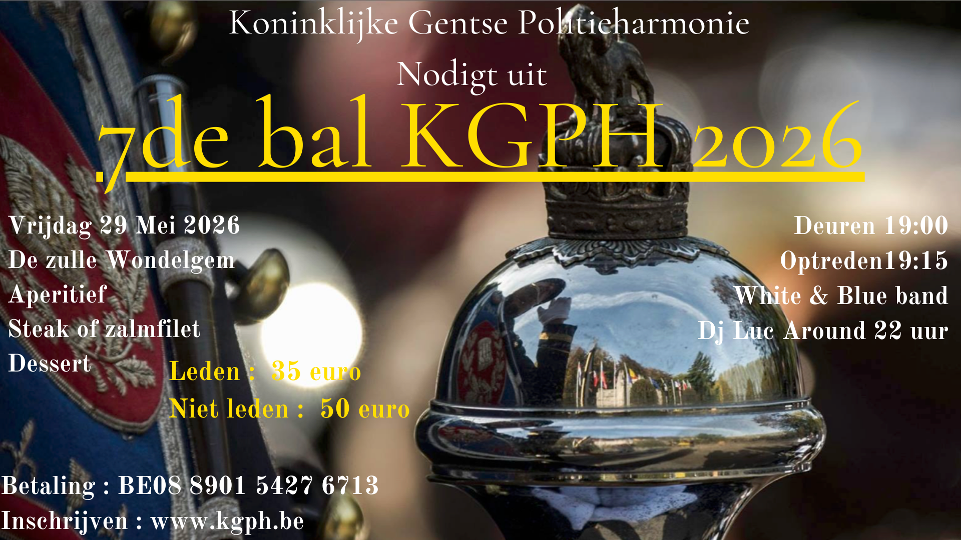 De deuren gaan open om 19.15u. We starten met een receptie opgeluisterd door de White en Bleu band van de KGPH onder leiding van Bert Lenny.